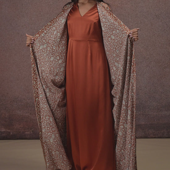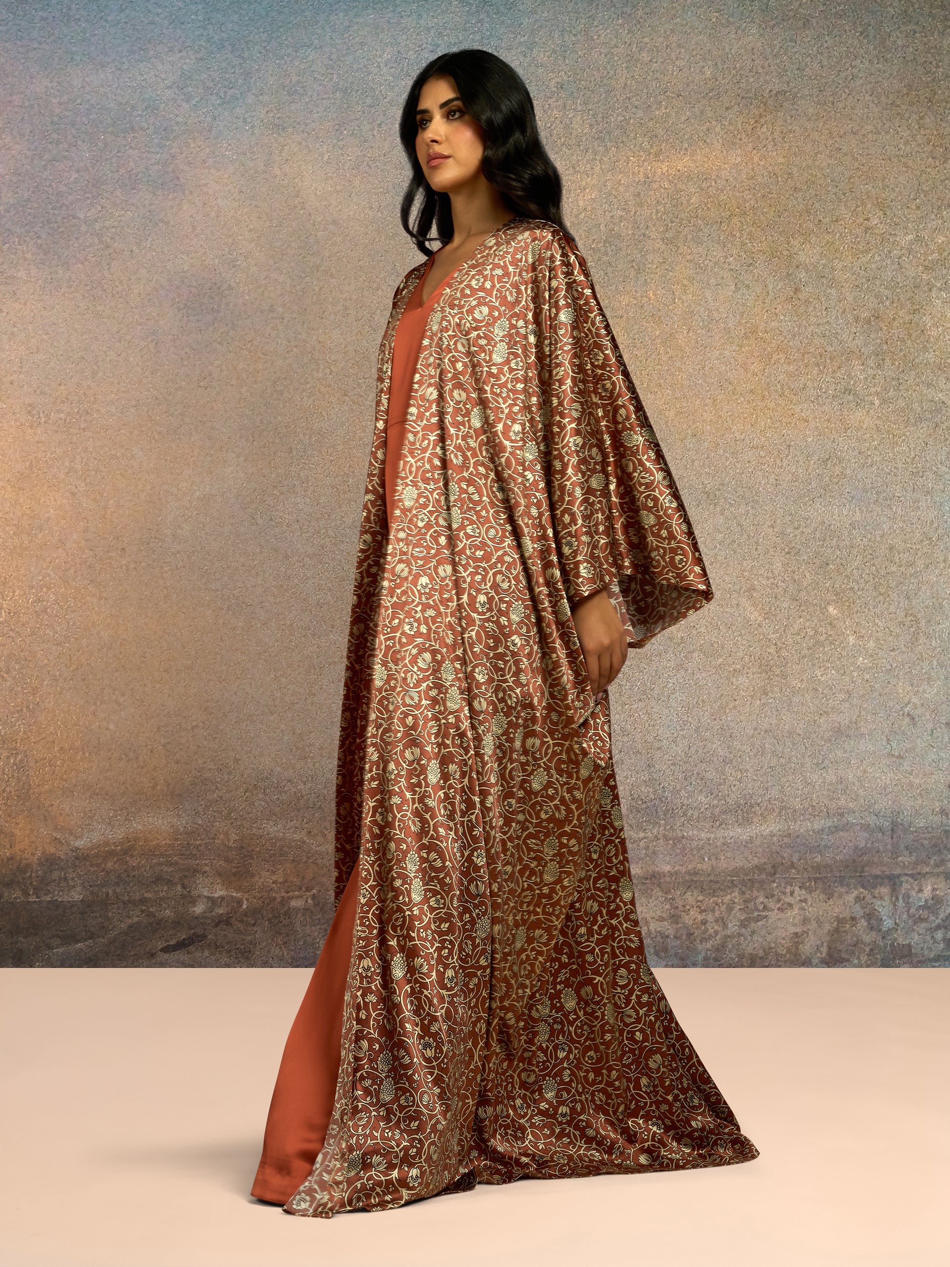 A beautiful Silk-satin dress elegantly paired with an open abaya in rich terracotta luxe, designed to move with quiet confidence. Featuring a seamless digital floral print, this coordinated set reveals a smooth, luminous surface that catches the light beautifully. A refined expression of modern sophistication, created for effortless, elevated styling.