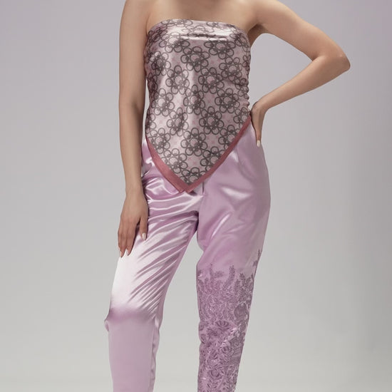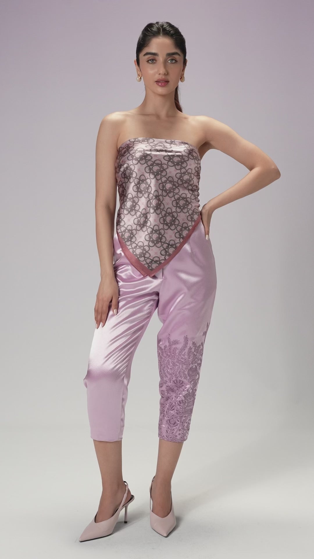 Tailored in lustrous satin, these capri pants are cropped to perfection for a modern, refined silhouette. A subtle embroidered flourish adds depth to the minimal design, making every detail feel intentional. Understated yet elevated - crafted for effortless sophistication.