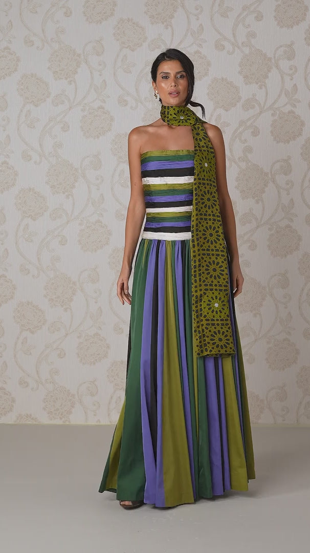 A work of contemporary artistry, this evening gown is a vibrant masterpiece of color. Tailored in luxurious Satin, the gown's striped bodice and panelled skirt are a beautiful blend of five colors: Honey Olive, Velvet Indigo, Forest Majesty, Charcoal Dust, and Porcelain Glow.
