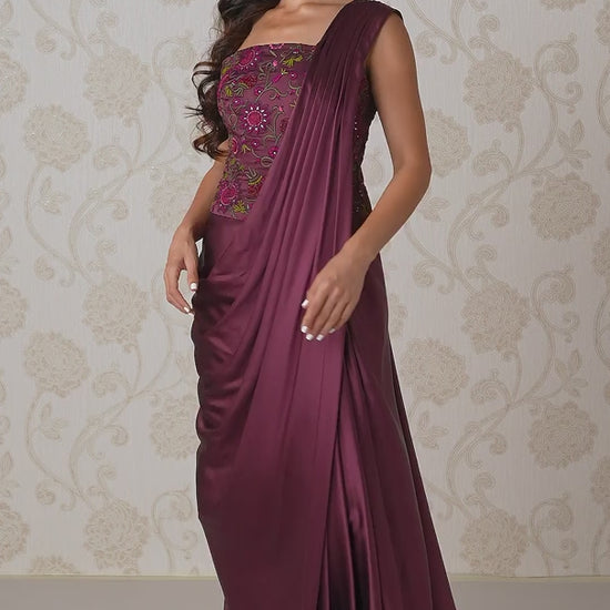 An exquisite play of drape and detail, this evening gown redefines elegance with a contemporary edge. Cut from sumptuous Silk Satin in a deep Wine Bouquet hue, it features a fluidly pleated drape that cascades with effortless grace, evoking the timeless charm of sari-inspired silhouettes. The strapless bodice, meticulously hand-embroidered in vibrant floral motifs, is illuminated with Swarovski crystals and glass bead accents — a tapestry of artistry that catches the light with every movement.