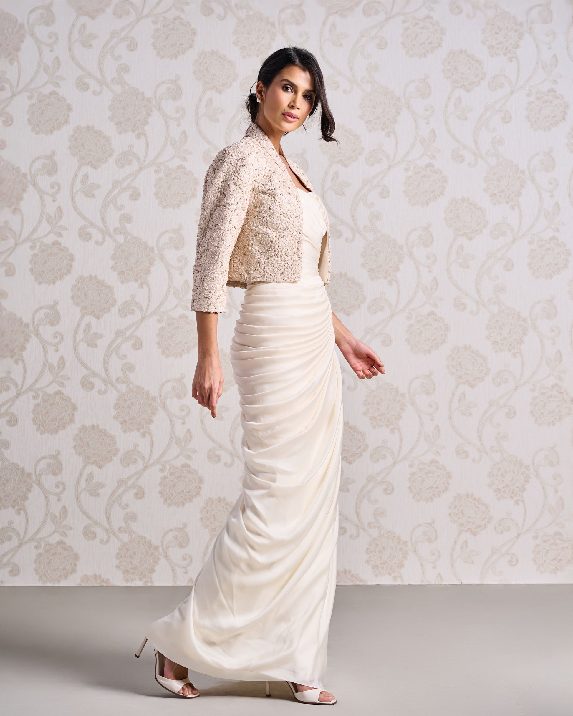 A study in timeless glamour, this two-piece evening gown & jacket is designed to radiate with effortless grace. Crafted from a blend of Silk Satin in a rich Champagne hue, the gown drapes beautifully with a ruched silhouette.