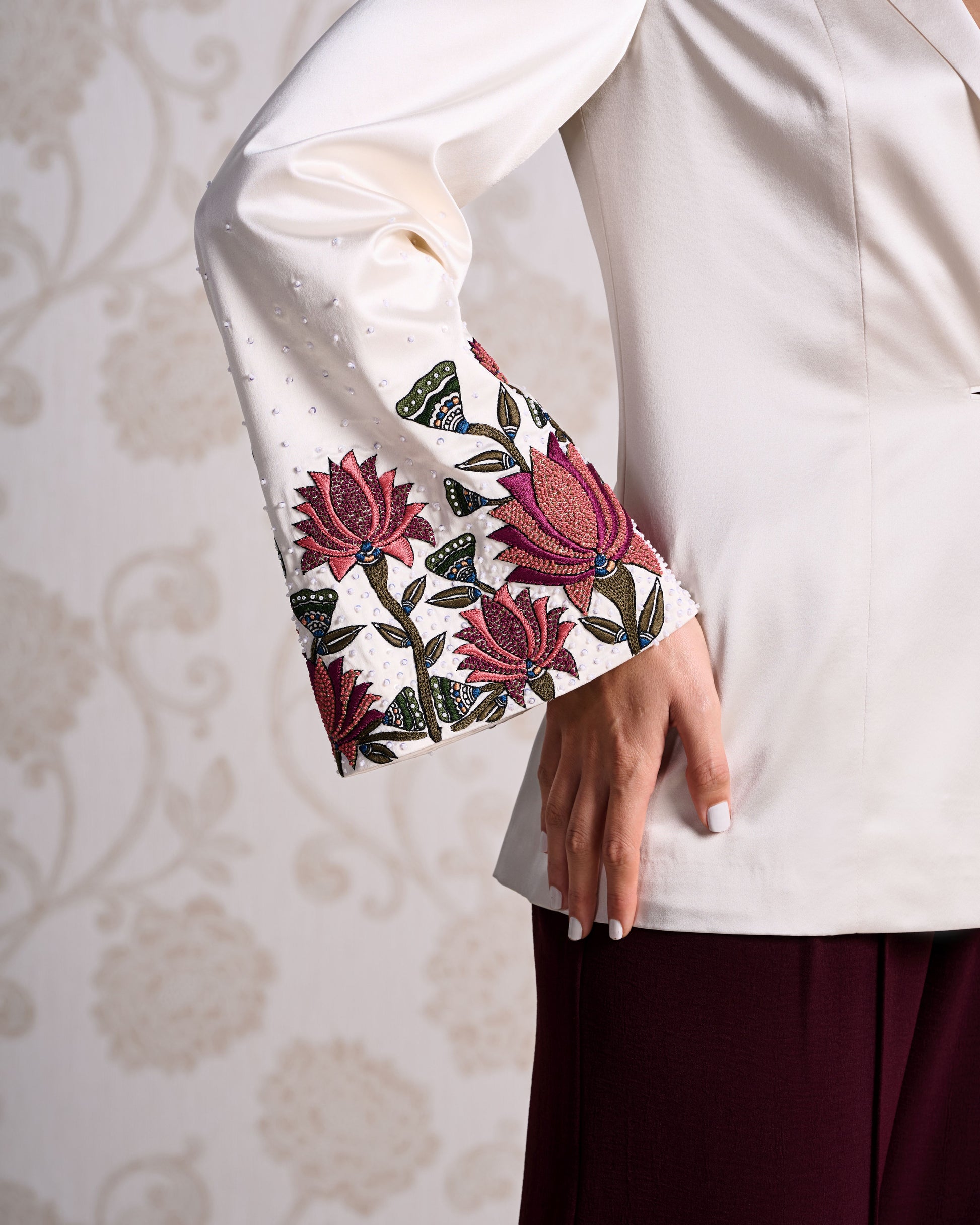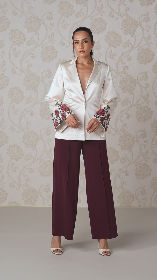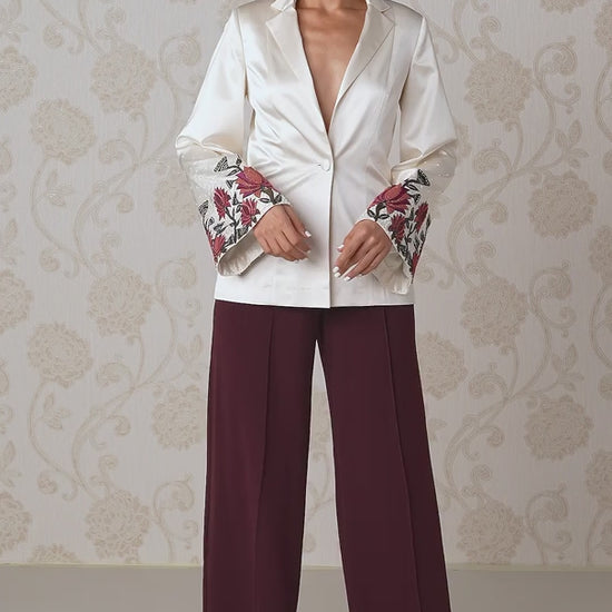 A modern twist on a classic silhouette, this jacket is a statement of sophisticated elegance. Tailored in luminous Silk Satin in a rich Champagne hue, the jacket with wide, flared cuffs are the focal point, brought to life with meticulous hand embroidery with shimmering metallic sequins and glass beads. This jacket is a versatile piece designed to elevate any ensemble with a touch of radiant artistry. Note: Pants used in the images are for styling purposes only!