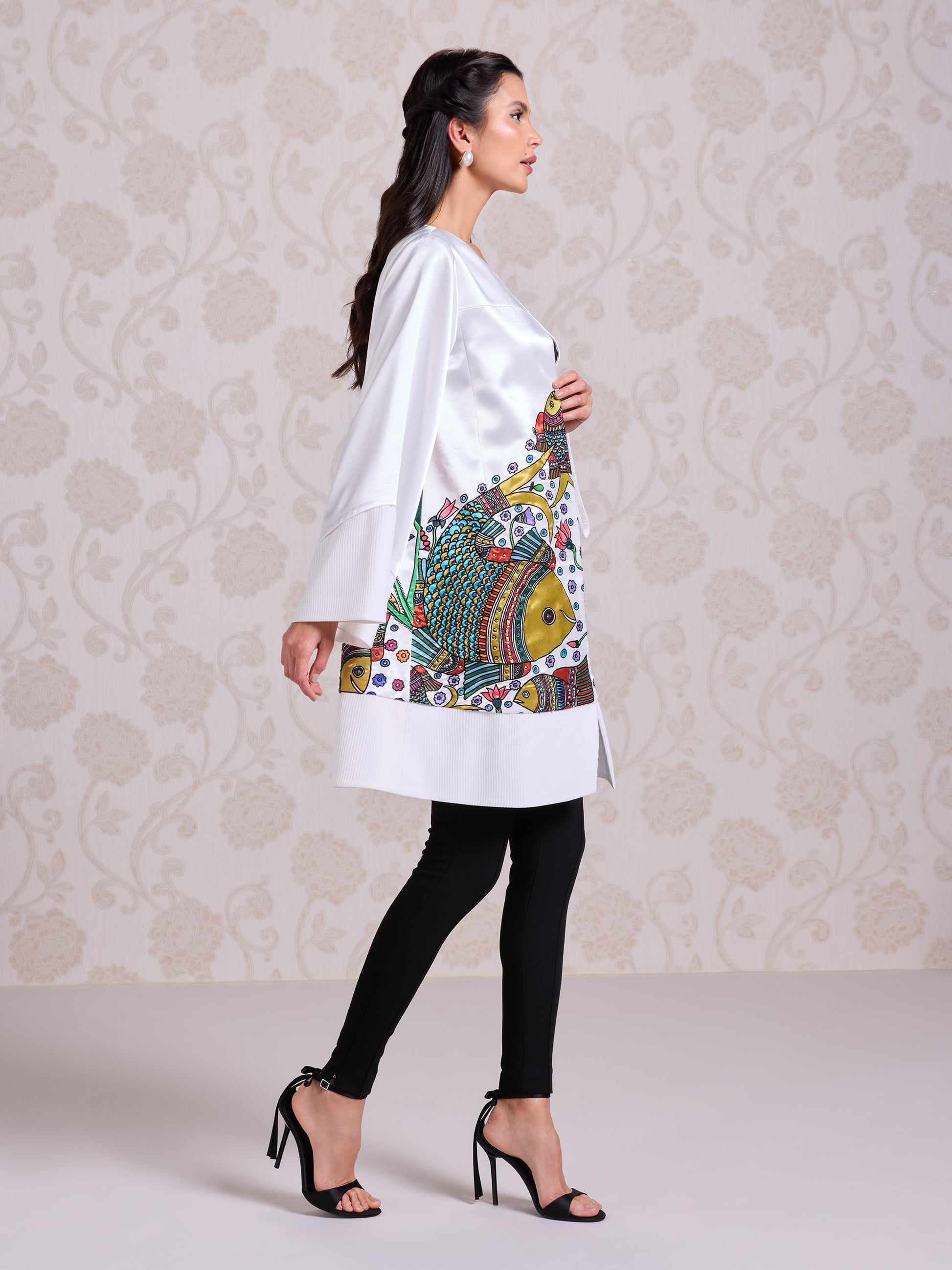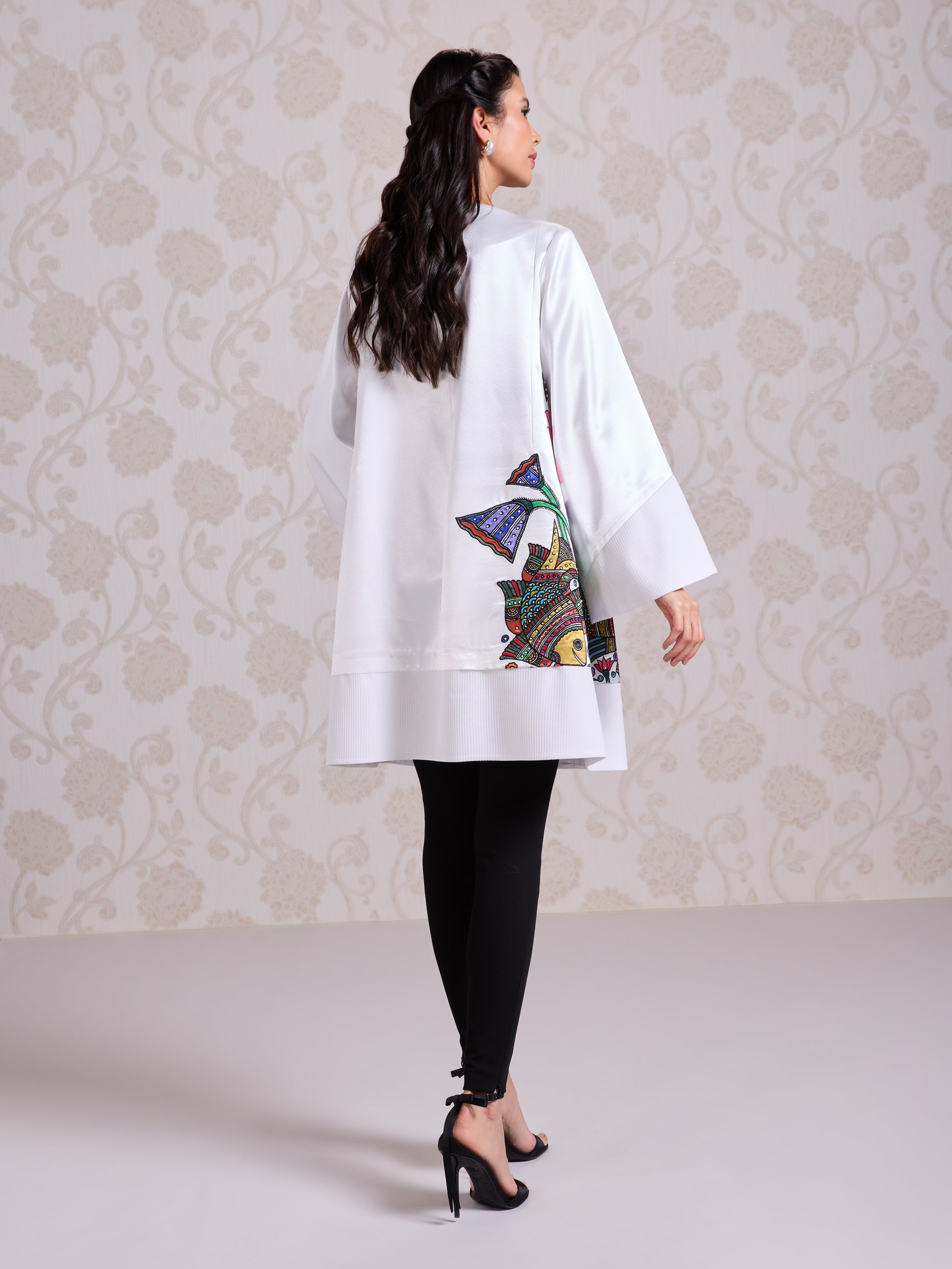 A refined longline jacket in soft Chantilly White, where fluid textures meet contemporary embellishment. Crafted in premium polyester satin with pleated chiffon extensions, it serves as a light, elegant canvas for the Madhubani art print. Swarovski crystals and delicate glass beads are thoughtfully placed to add dimension and a gentle shimmer. Graceful, modern, and intricately detailed. Note: Pants & Top used in the images are for styling purposes only!
