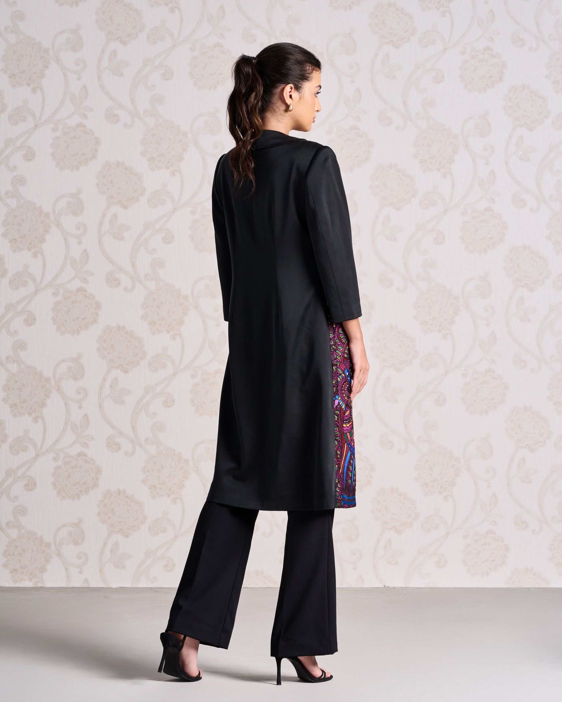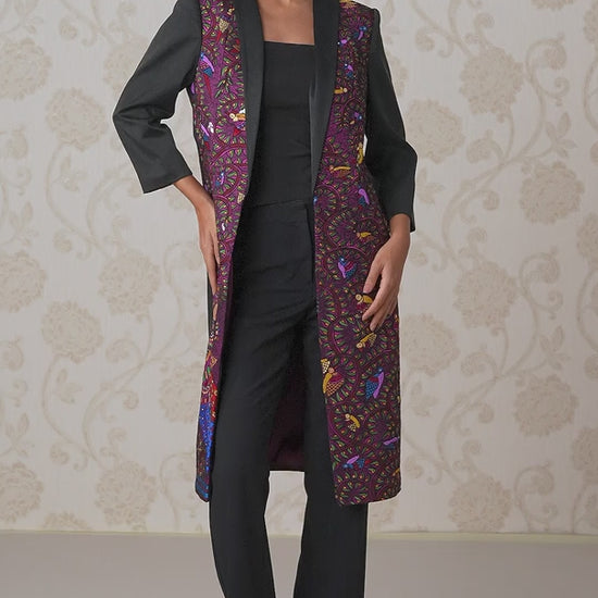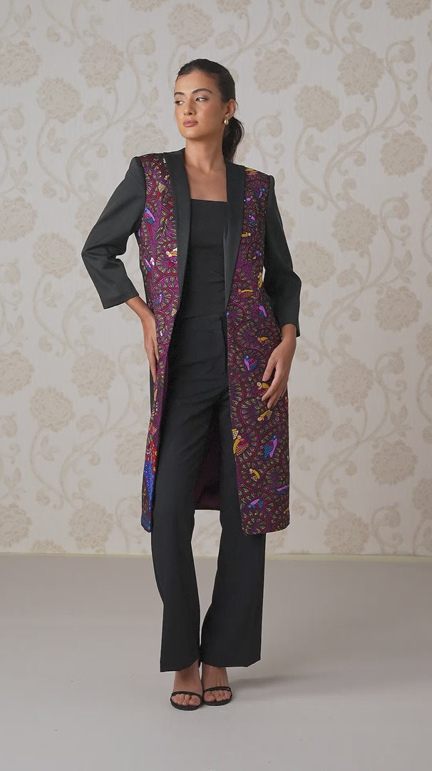 A powerful fusion of tailoring and Madhubani art, this jacket is a statement piece. The sleek silhouette, cut from lustrous Silk Satin, features a classic Charcoal Dust base. The front of the longline jacket is a canvas for intricate machine embroidery in a contrasting Persian Rose hue, a narrative print that comes to life with the sparkle of Swarovski crystals and glass beads. Note: Pants & Top used in the images are for styling purposes only!
