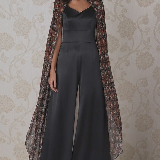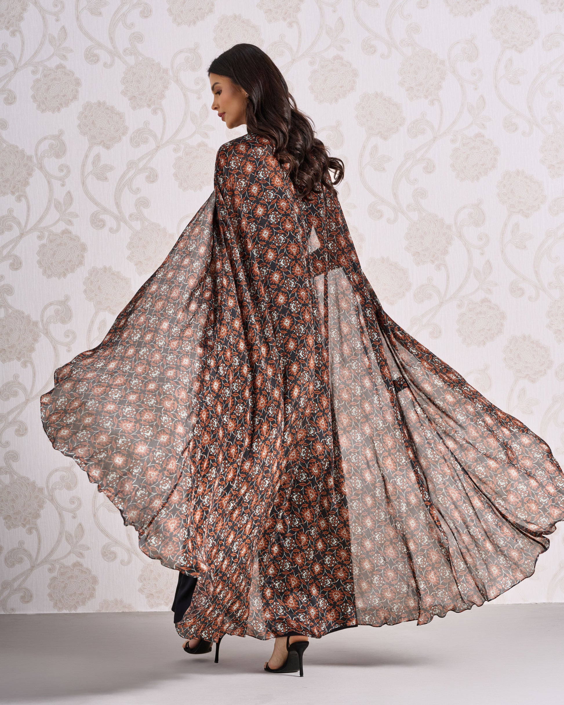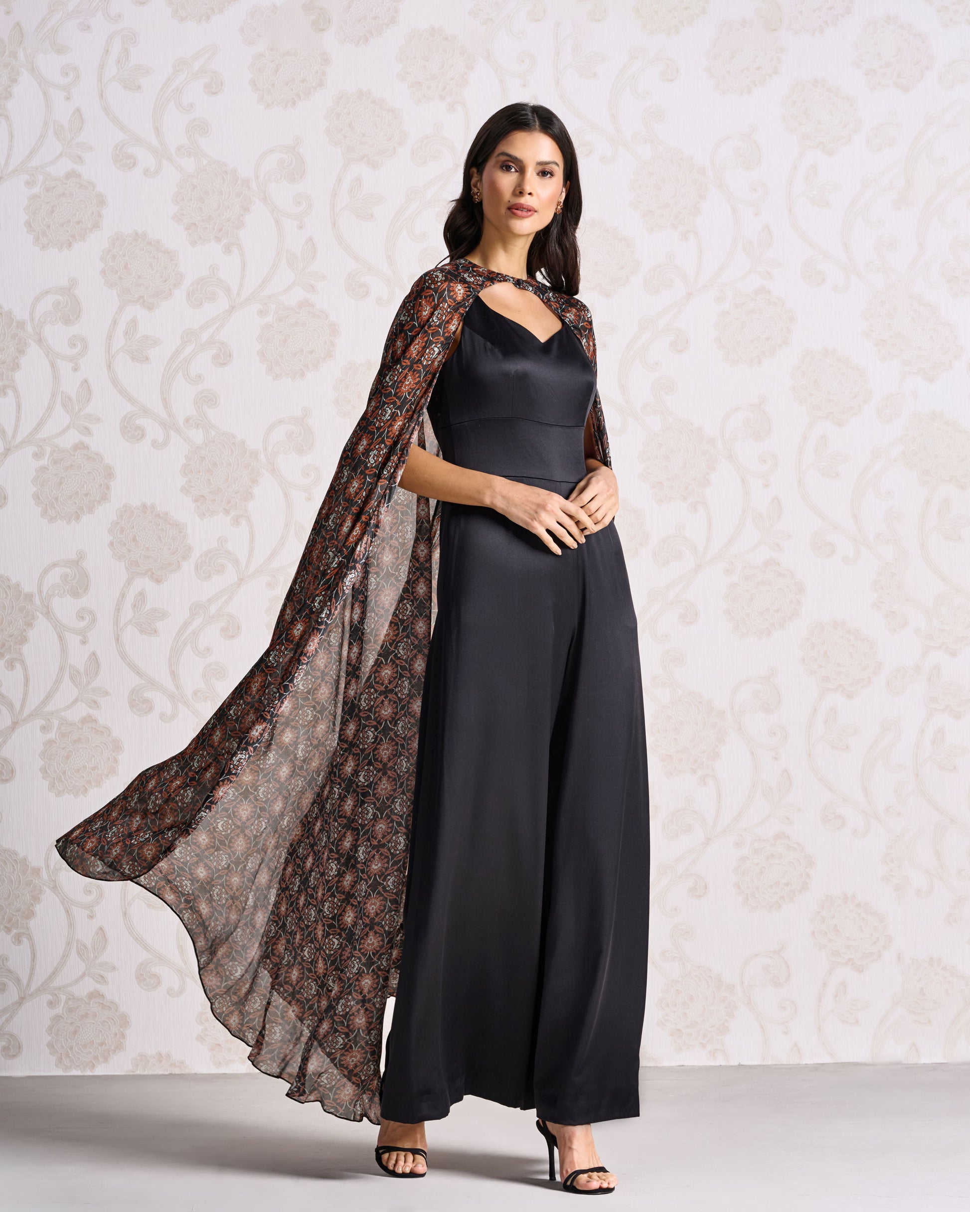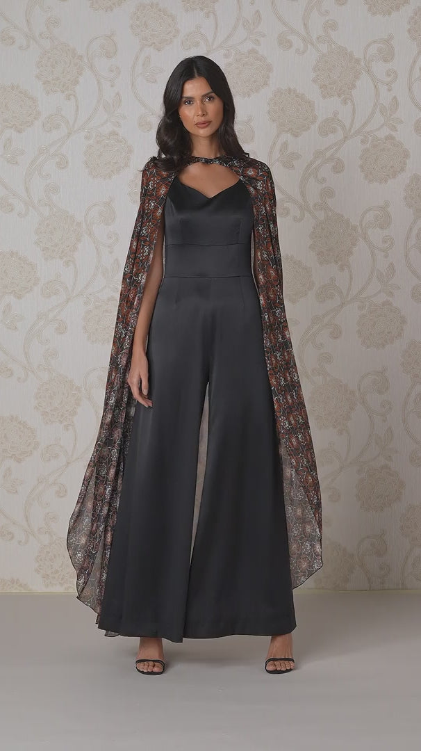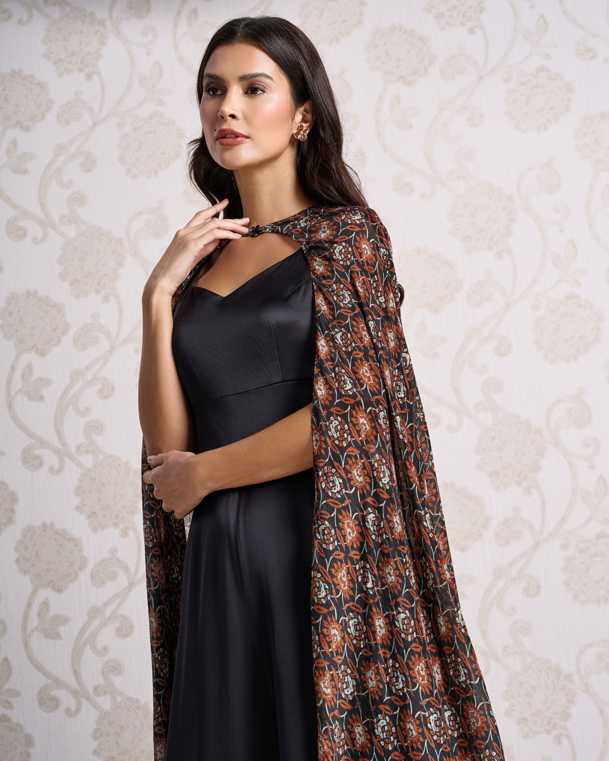 A dramatic masterpiece of wearable art, this set transcends conventional boundaries with bold sophistication. The foundation of lustrous Silk Satin in deep Charcoal Dust features a modern cutout neckline that frames the silhouette. A flowing Chiffon cape adorned with striking digital print cascades with theatrical grace, creating a powerful fusion of structured elegance and bohemian poetry that commands attention.