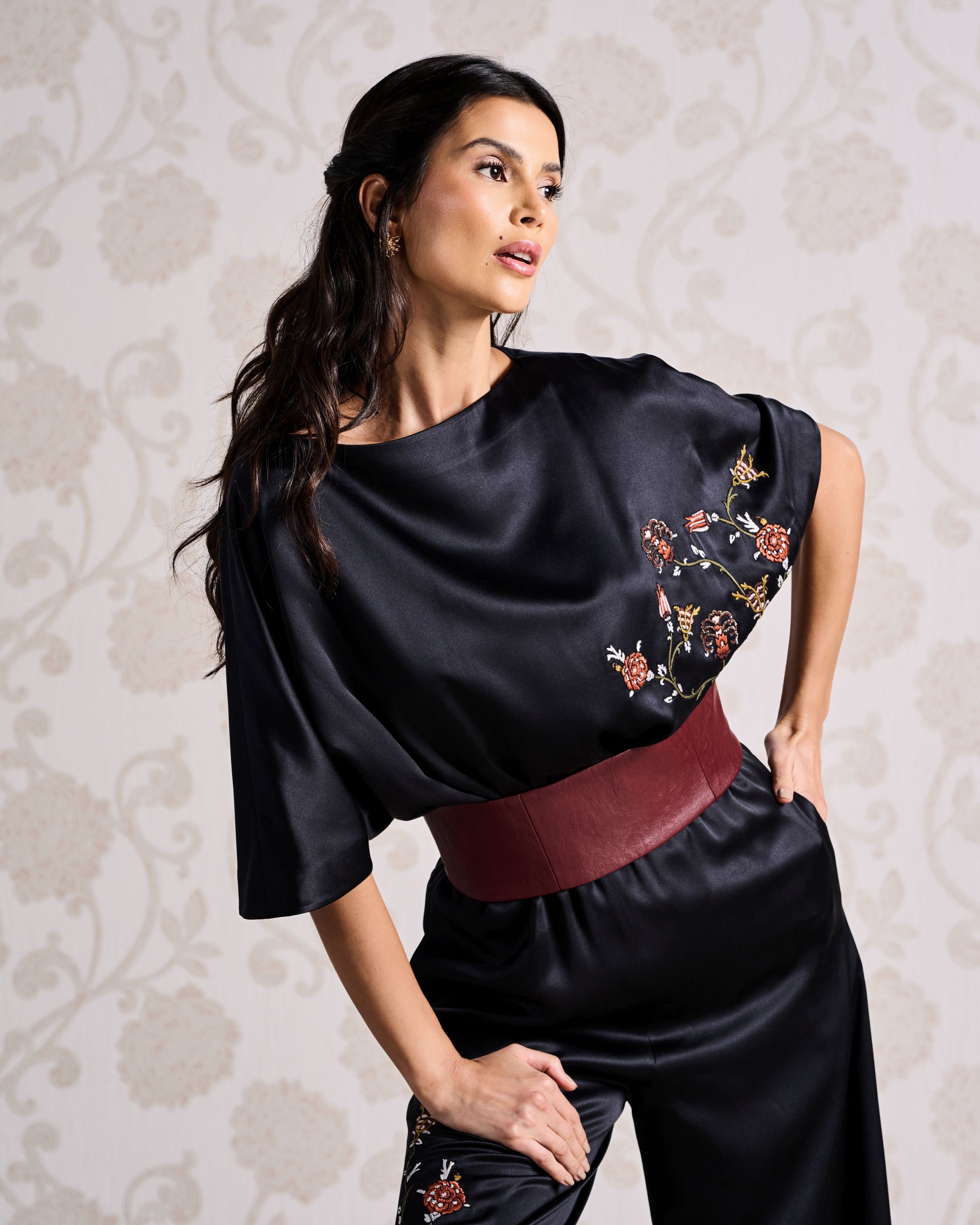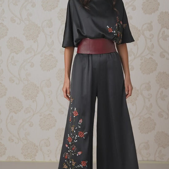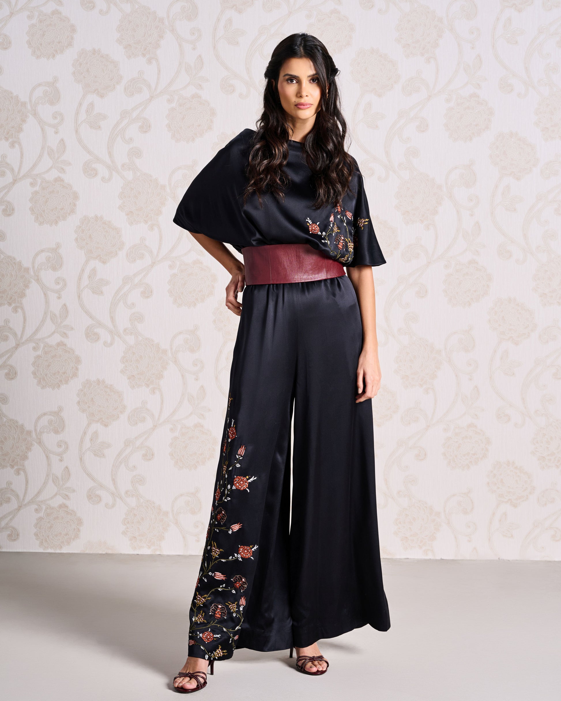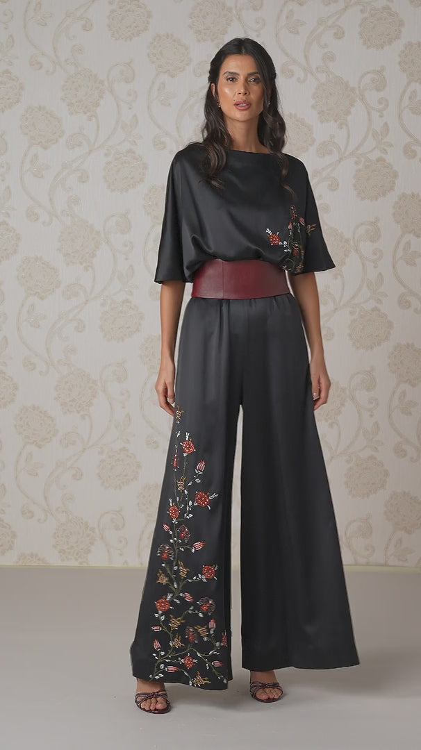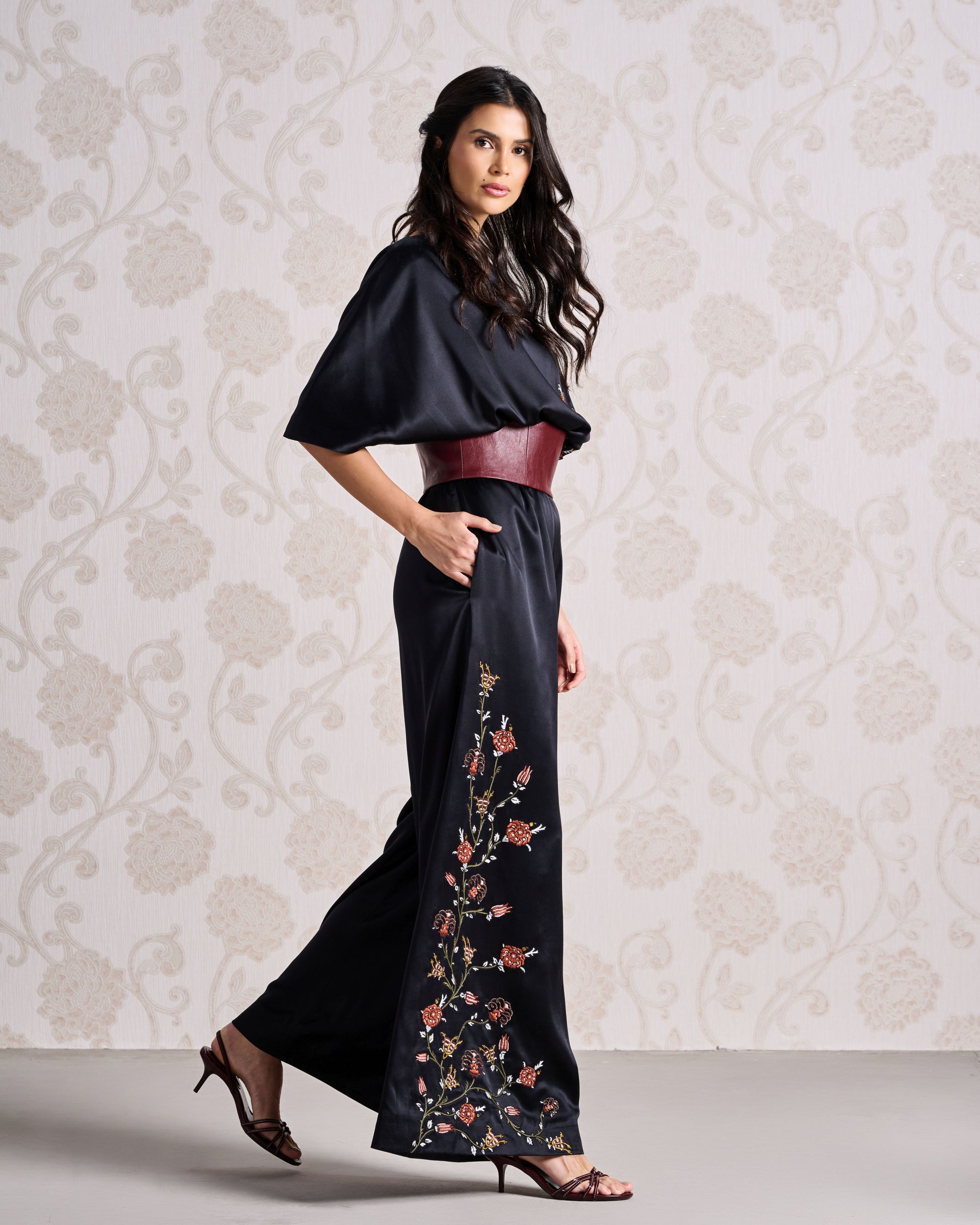 A study in effortless luxury, this jumpsuit redefines modern elegance with its fluid silhouette. Tailored from sumptuous Silk Satin in rich Charcoal Dust, the relaxed bodice flows seamlessly into wide-leg trousers that move with graceful ease. One side blooms with exquisite hand embroidery and shimmering metallic sequins, while a bold vegan leather belt creates a striking architectural accent that celebrates the harmony of comfort and sophistication.