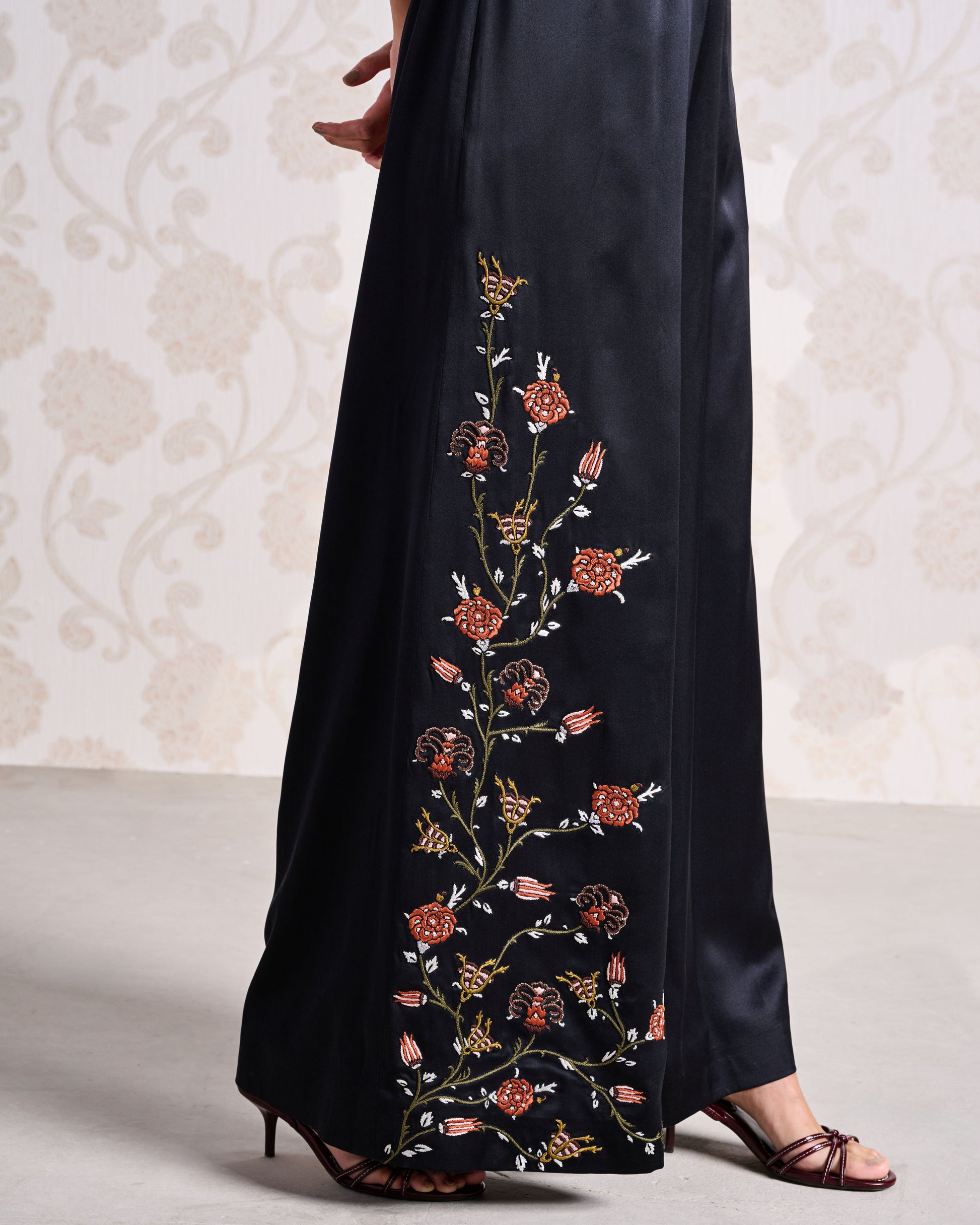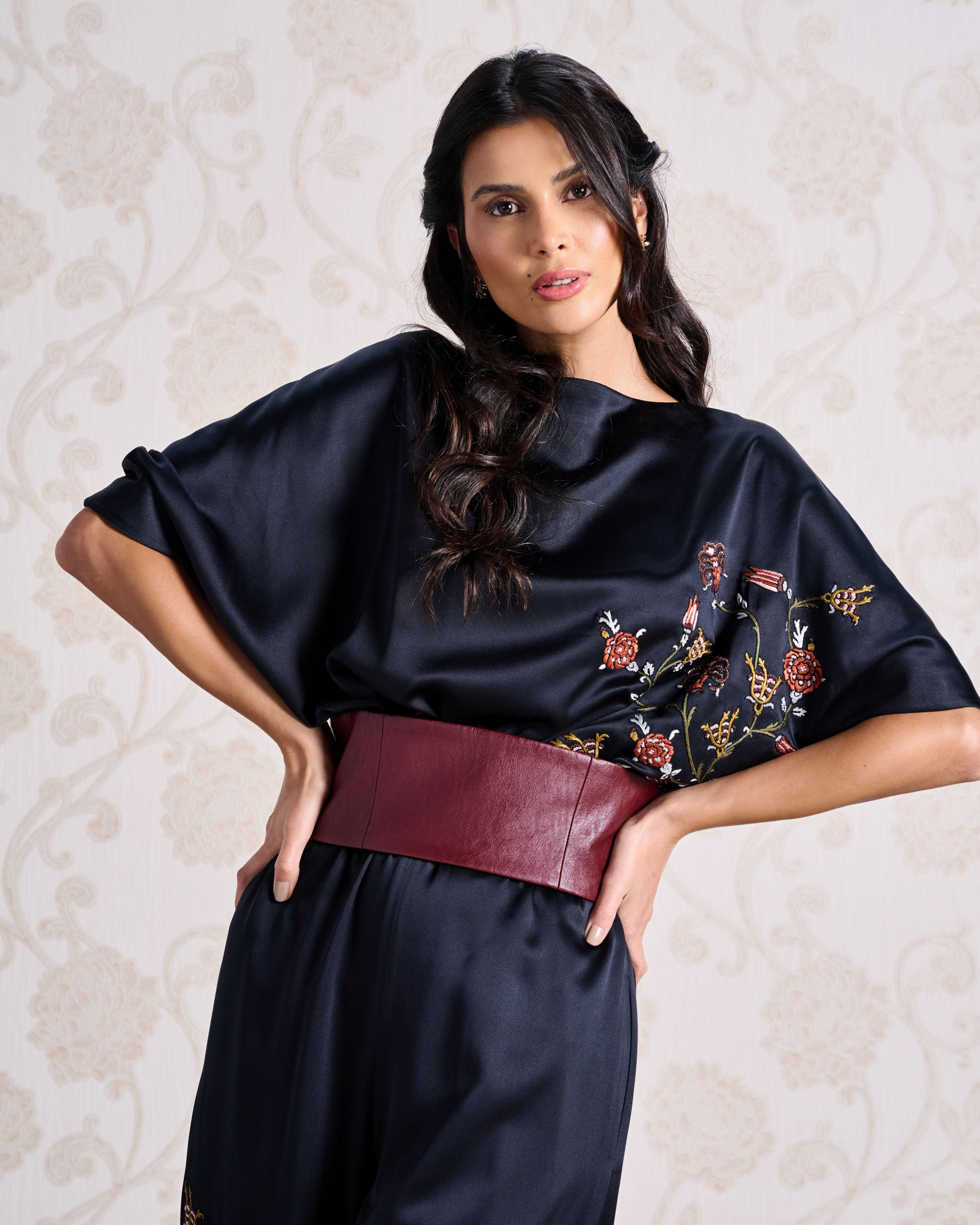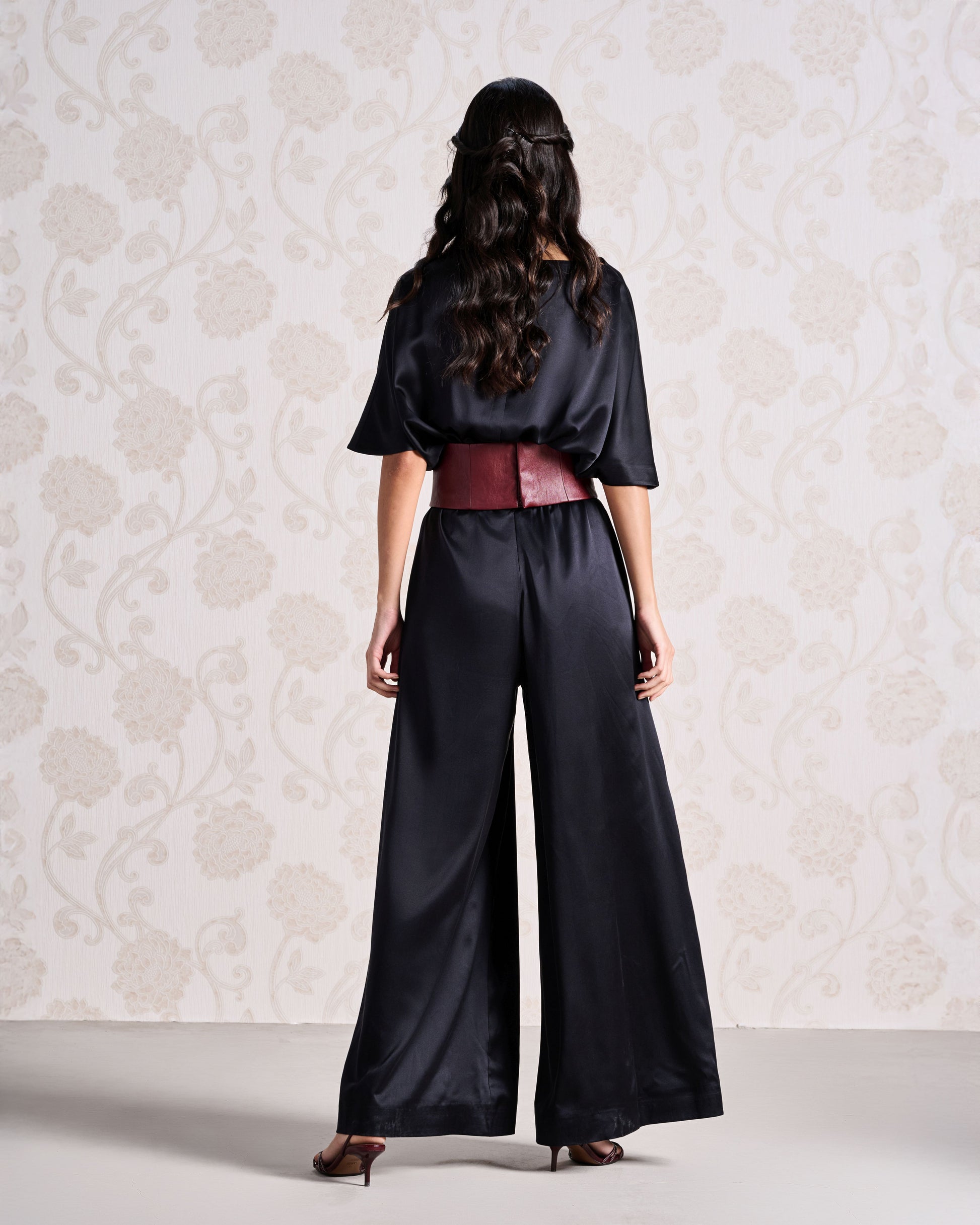 A study in effortless luxury, this jumpsuit redefines modern elegance with its fluid silhouette. Tailored from sumptuous Silk Satin in rich Charcoal Dust, the relaxed bodice flows seamlessly into wide-leg trousers that move with graceful ease. One side blooms with exquisite hand embroidery and shimmering metallic sequins, while a bold vegan leather belt creates a striking architectural accent that celebrates the harmony of comfort and sophistication.