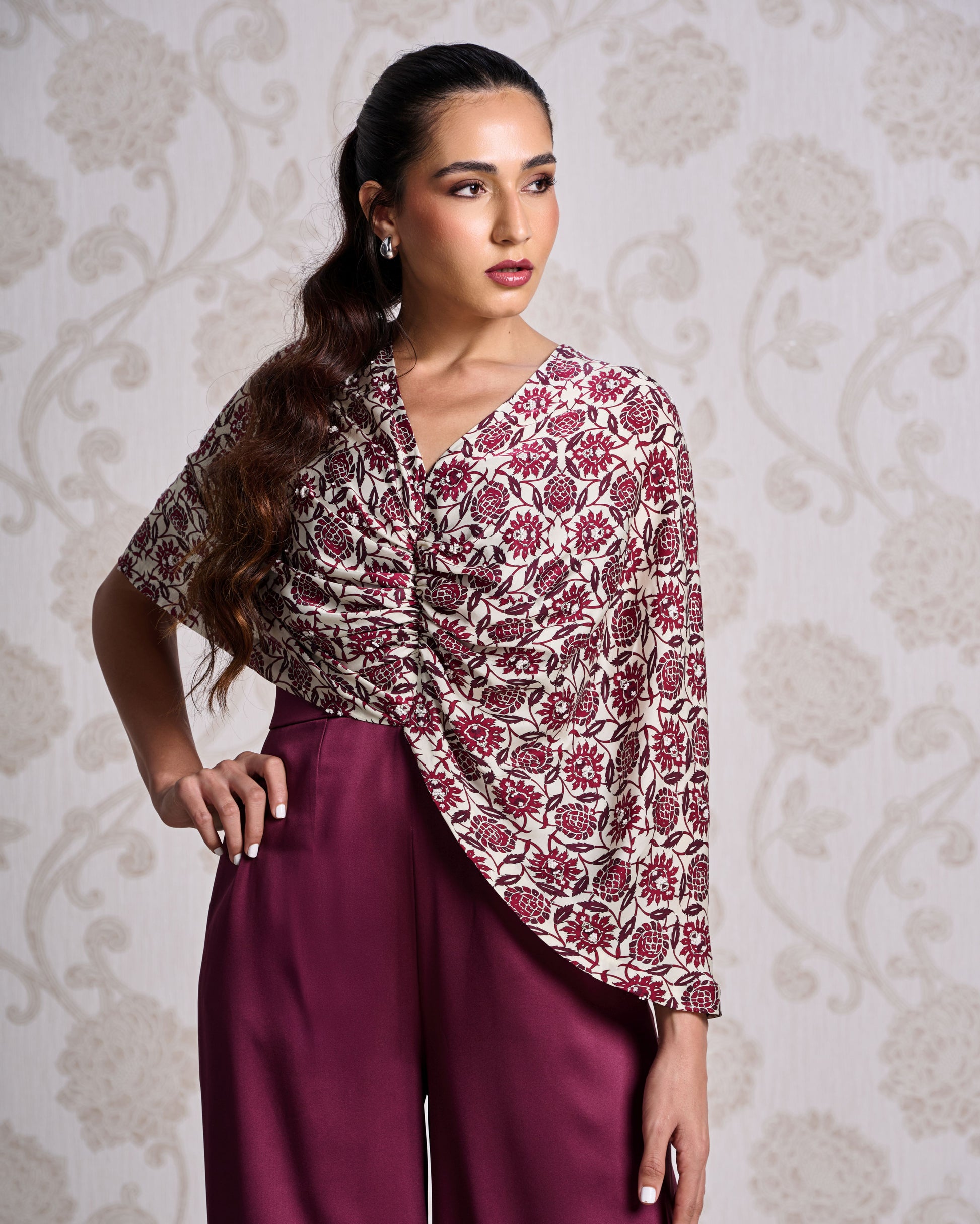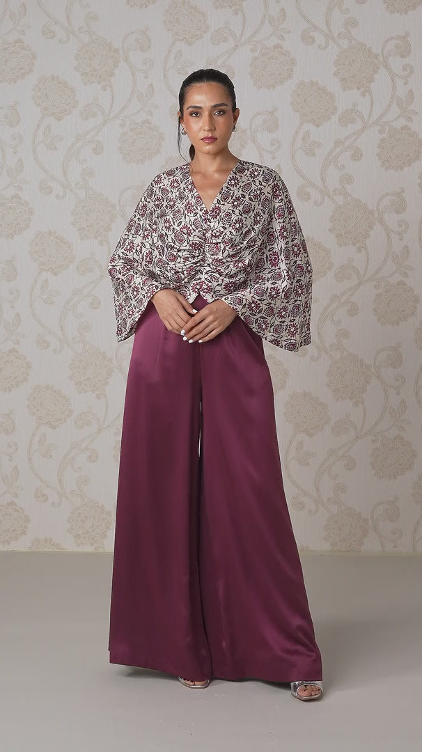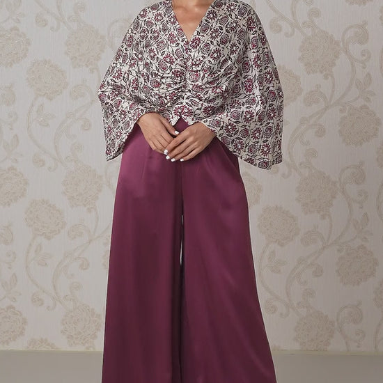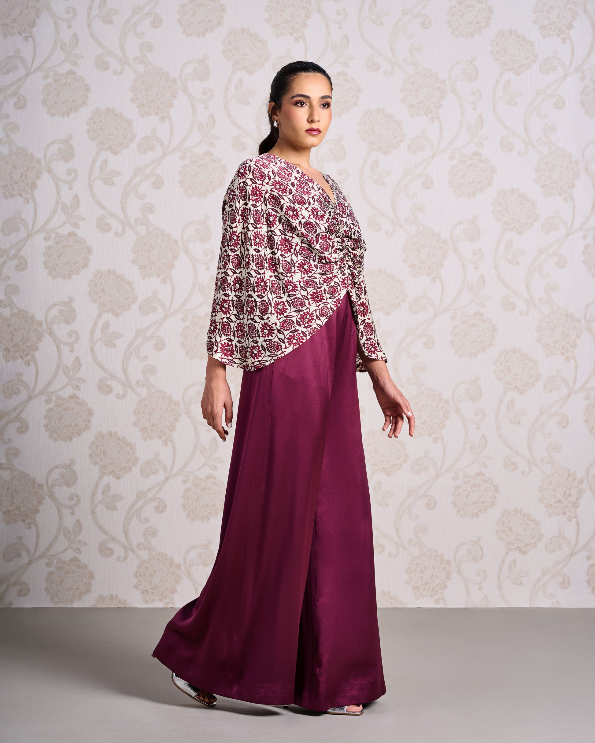 An artistic dialogue of color and form, this jumpsuit celebrates the beauty of sophisticated contrast. The bodice, rendered in soft Porcelain Glow, features delicate digital print and a sculptural twisted detail enriched with hand-placed glass beads. Wide-leg trousers in rich Wine Bouquet flow made from luxurious Silk Satin, create a harmonious composition of graceful movement and refined elegance.
