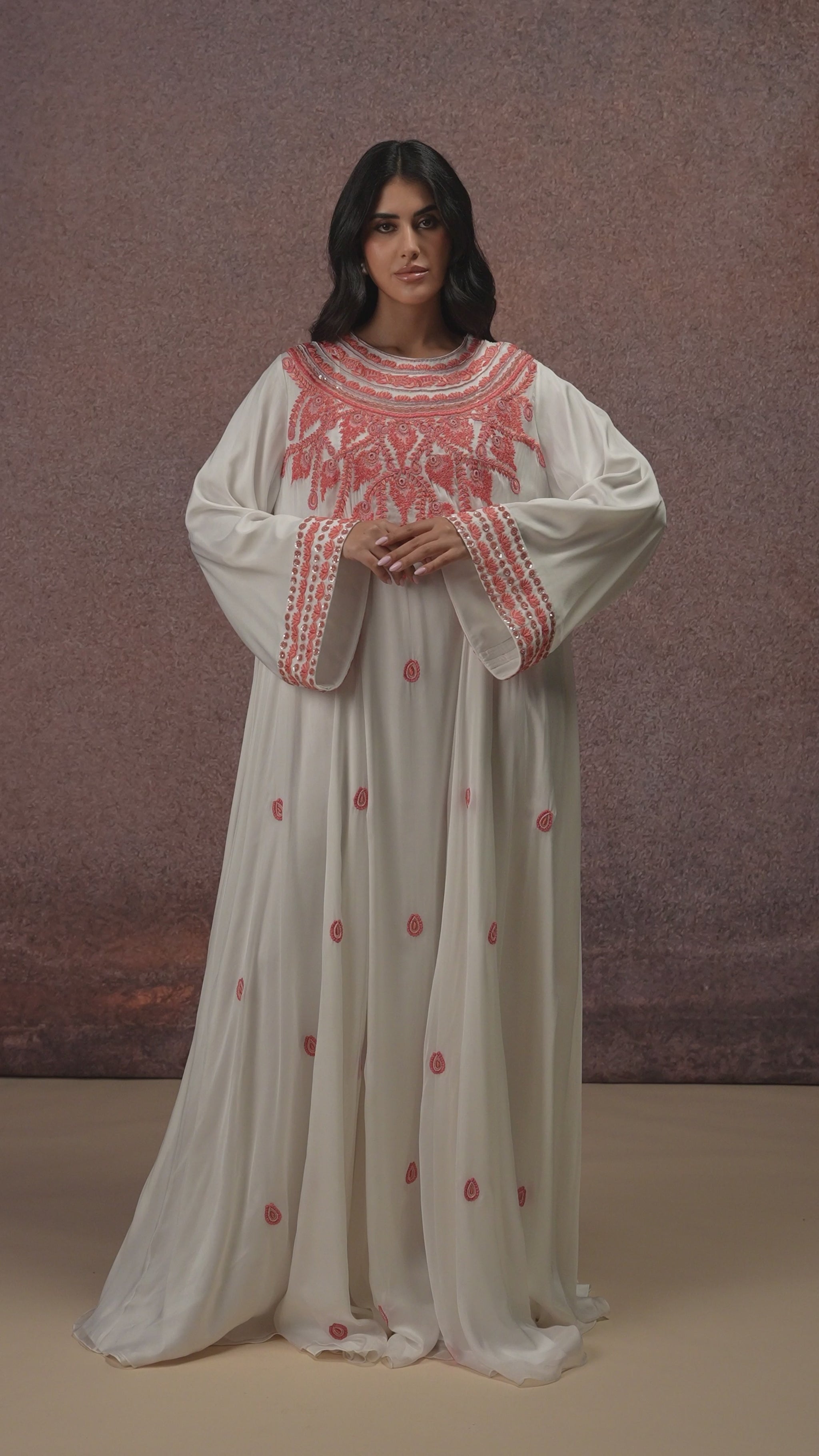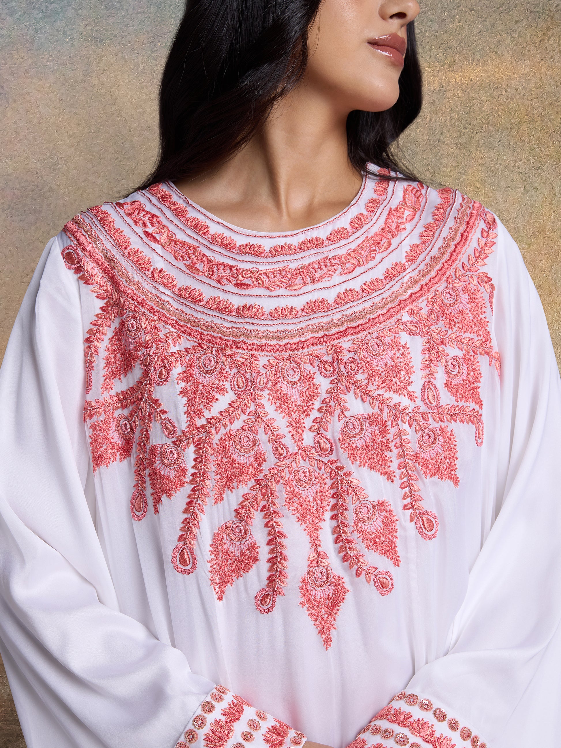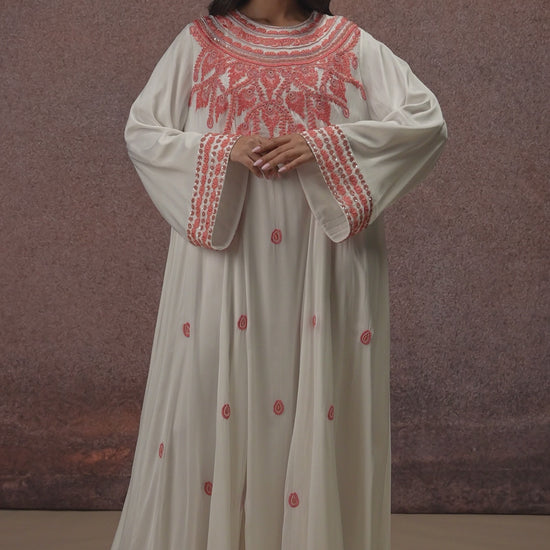 A couture-inspired chiffon kaftan in a luminous Champagne hue, exquisitely hand-embroidered with recycled pearls, metallic sequins, and glass beads. Featuring a round neckline and an intricately embellished yoke, the design is balanced by wide structured cuffs and a softly ruffled hem. Light in movement yet rich in detail, this piece embodies refined artistry and elevated elegance.