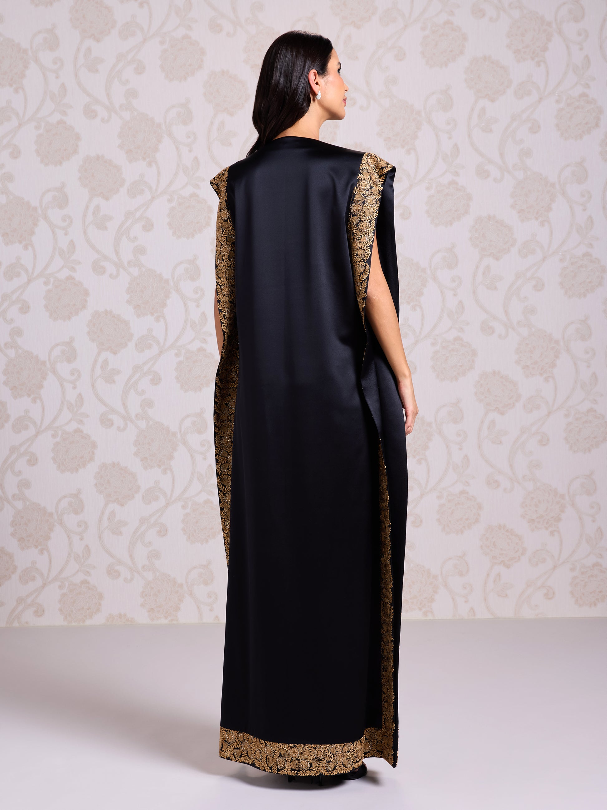 A work of luxurious artistry, this kaftan embodies timeless sophistication with contemporary flair. Crafted from sumptuous Silk Satin in deep Charcoal Dust, the flowing silhouette drapes with regal elegance. The V-neckline is framed by an exquisite border of intricate machine embroidery that blooms with architectural precision, enhanced by sparkling Swarovski crystals that create a luminous frame for this statement piece of refined luxury.
