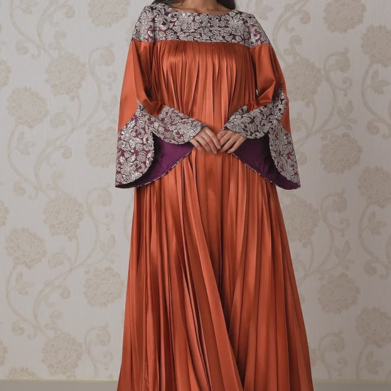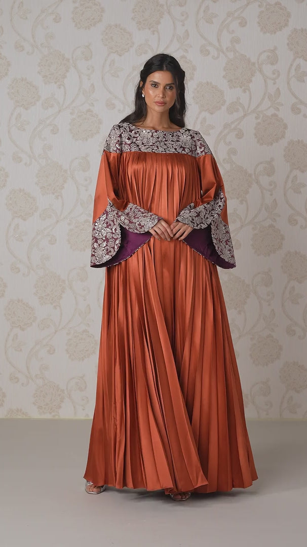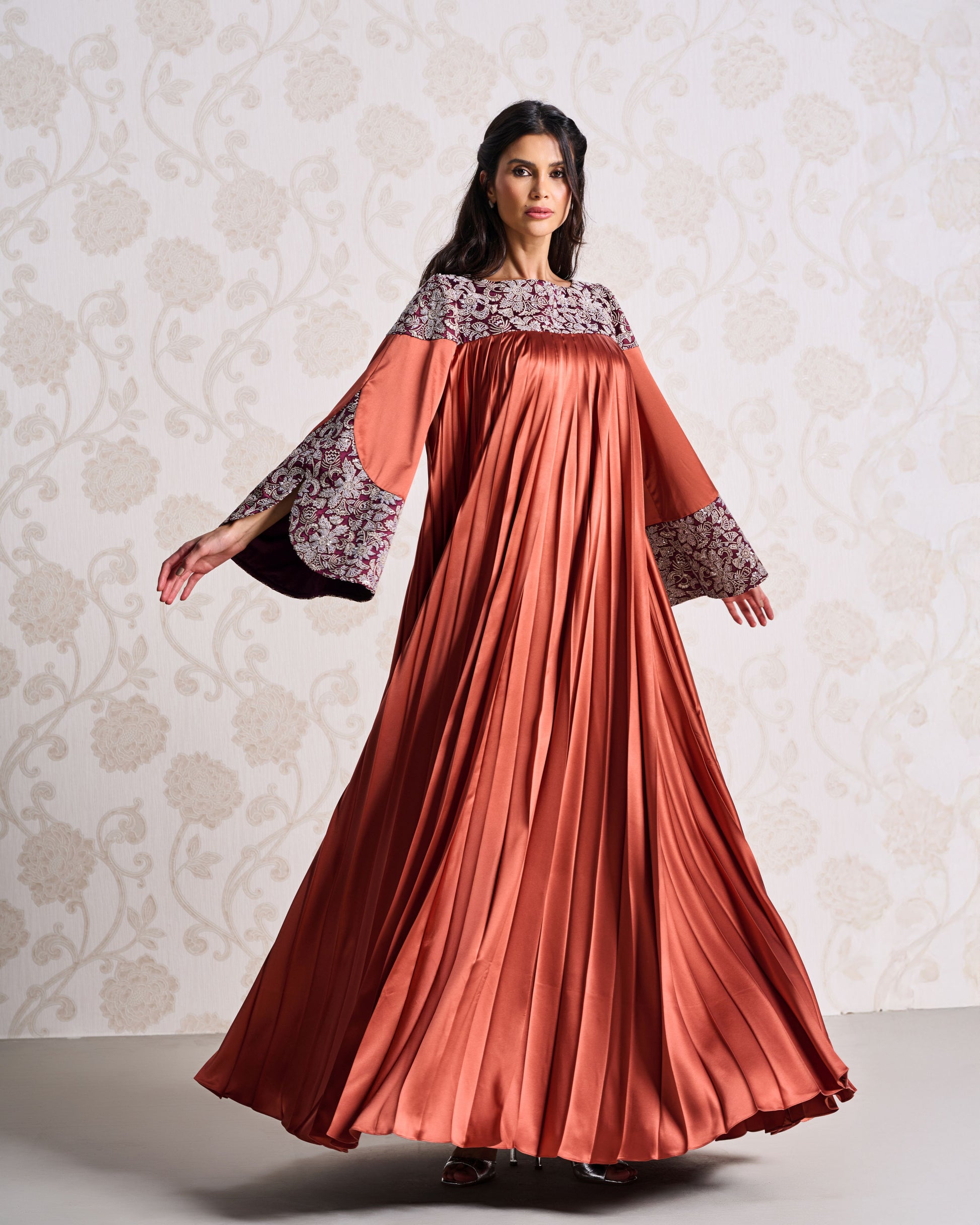 A testament to graceful contrast, this kaftan celebrates the poetry of color and craftsmanship. The body flows in lustrous Silk Satin rendered in rich Terracotta Luxe, with pleats that create movement and architectural interest. The neckline and wide sleeves transform into a canvas of Wine Bouquet, adorned with intricate hand embroidery that speaks to the artisan's touch and creates a sophisticated dialogue between comfort and couture elegance.