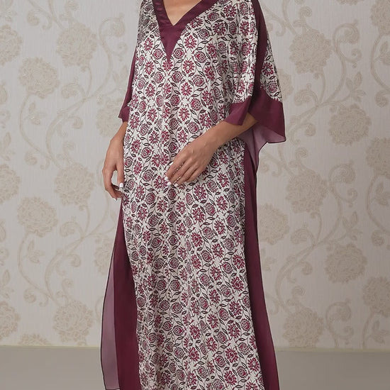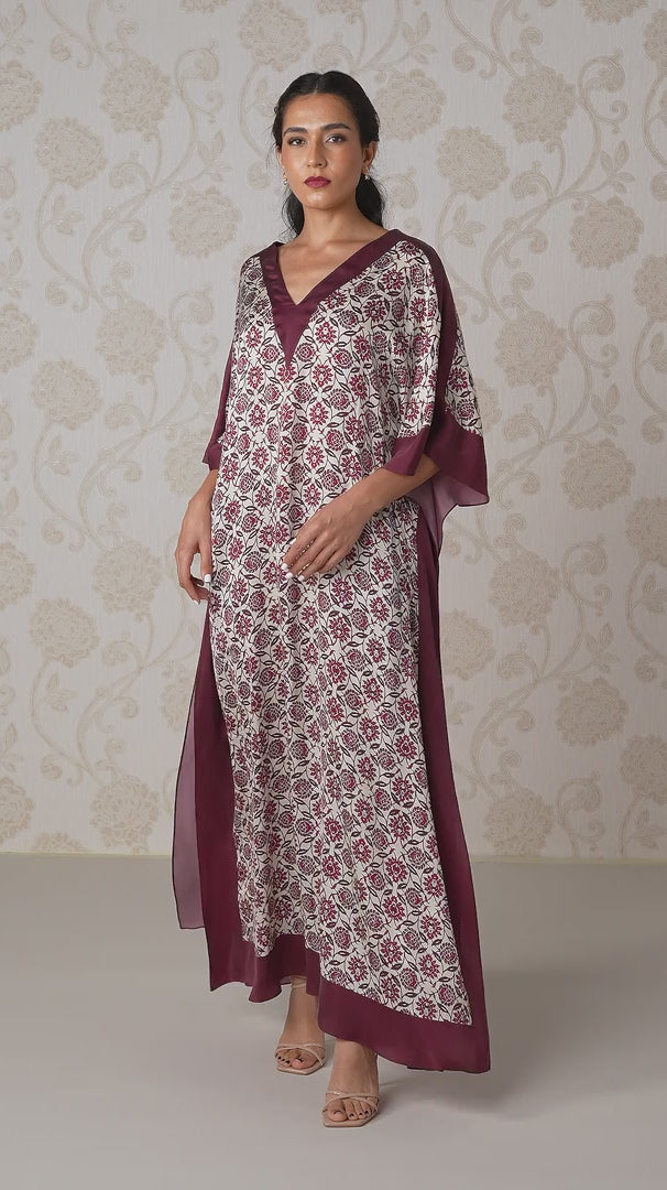 A flowing canvas of artistry, this kaftan captures the essence of effortless elegance. Crafted in luxurious satin and bathed in a deep Wine Bouquet hue, it features a mesmerizing all-over print. The classic V-neck and easy slip-on silhouette embody timeless comfort, while refined detailing elevates it into a statement of contemporary chic.