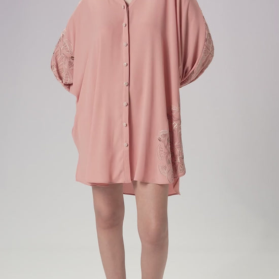Meet your throw-on-and-go fave with a soft, feminine twist. Flowy v-neck shirt with voluminous sleeves and a high-low hem for effortless movement. Machine embroidery adds a subtle, artful touch. Easy, airy, statement-ready.