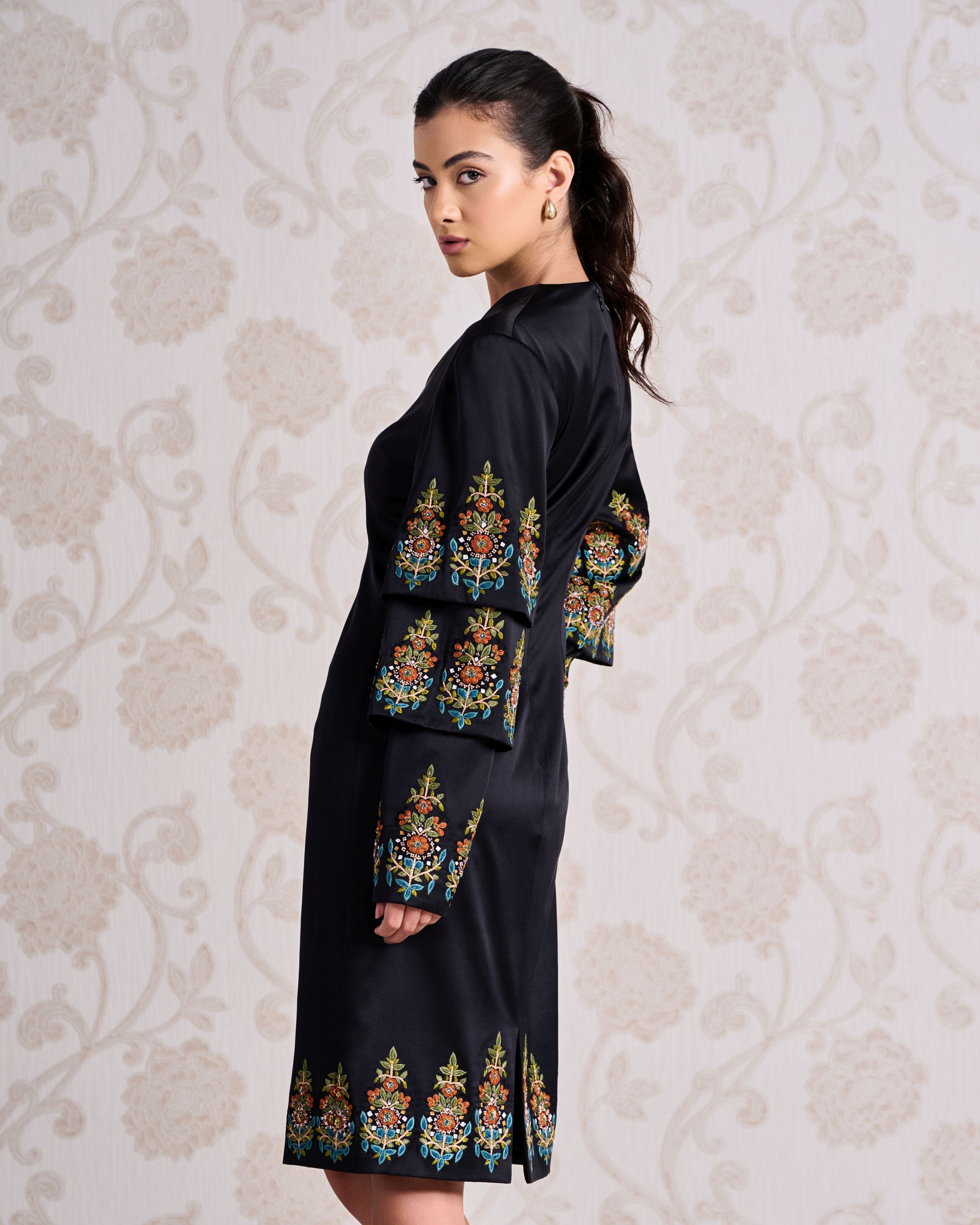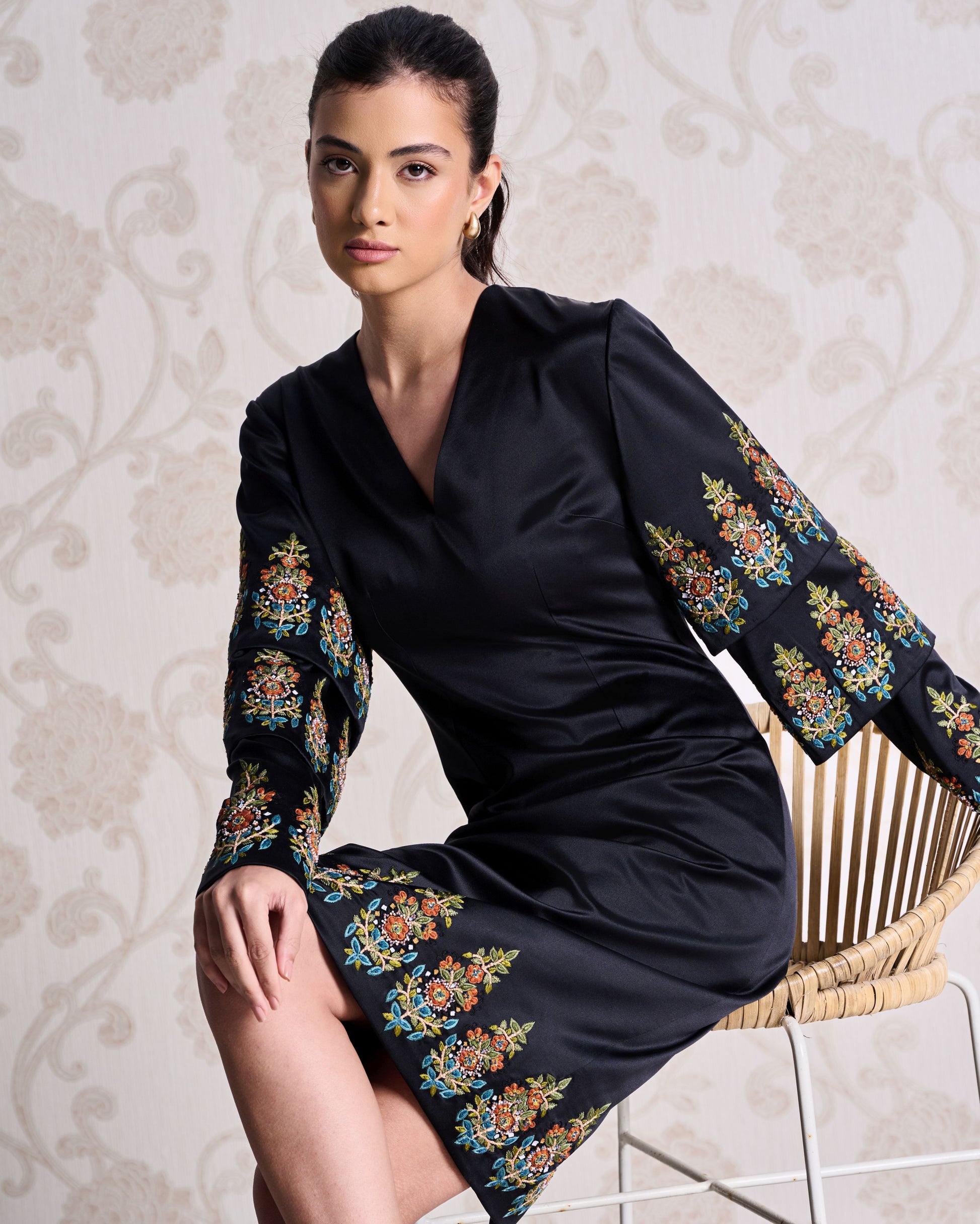 A modern fusion of clean lines and intricate detail, this short dress is a statement of contemporary artistry. Cut from sleek Silk Satin in a deep Charcoal Dust hue, the dress features a tailored silhouette with a refined V-neckline. The hemline and stunning three-layered sleeves are adorned with rich hand embroidery, organza appliqué, dual-toned sequins, and glass beads, adding vibrant dimension to the dark fabric.