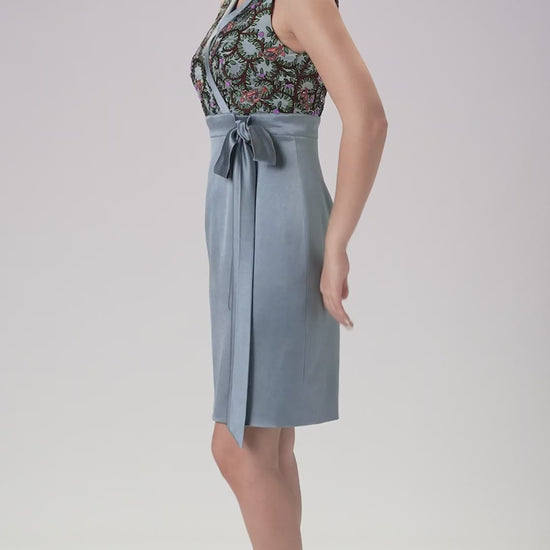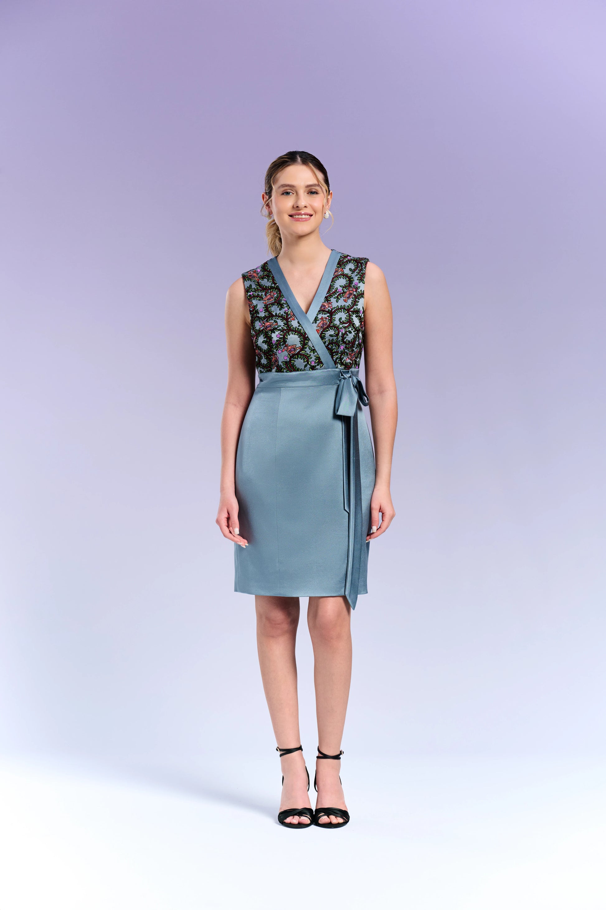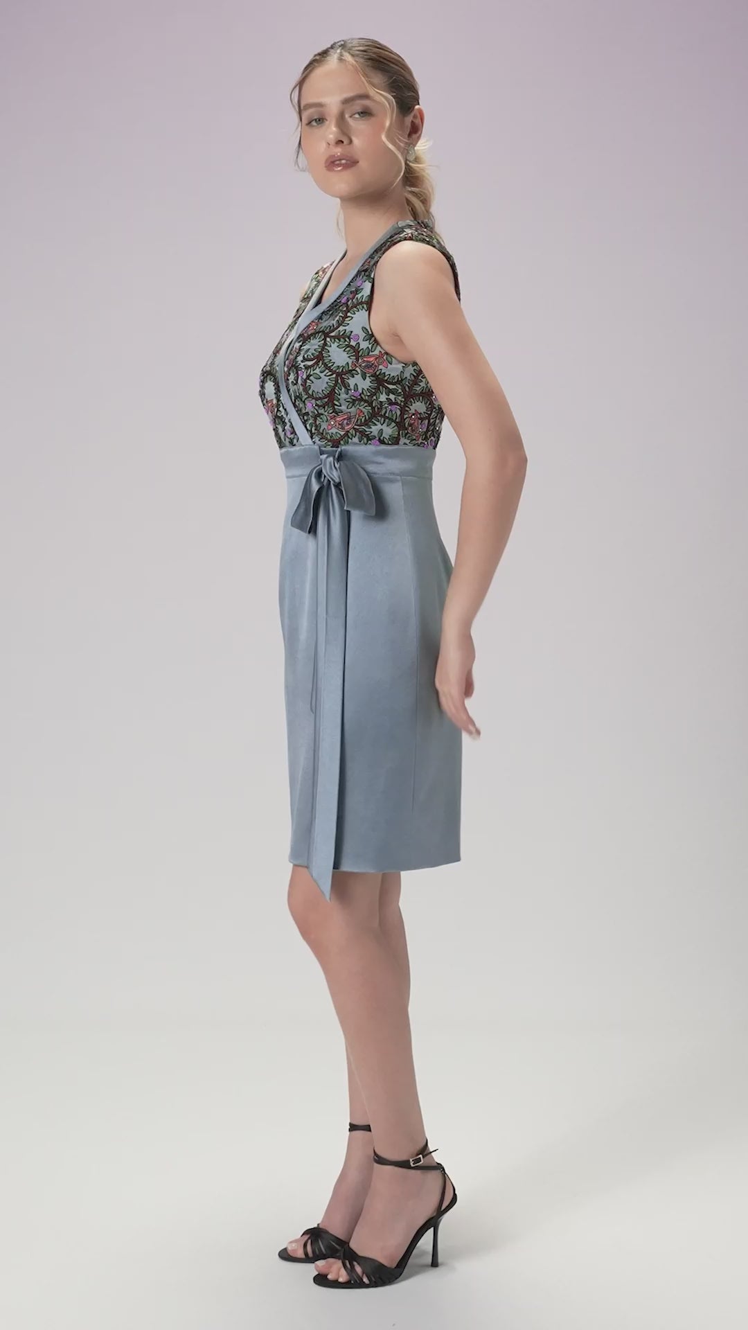A glacier blue short dress featuring a beautifully embroidered bodice that stands out with subtle detail. Designed with a relaxed neckline for an easy, breezy feel, it balances structure with softness. Effortless, elevated, and made to be worn with confidence.