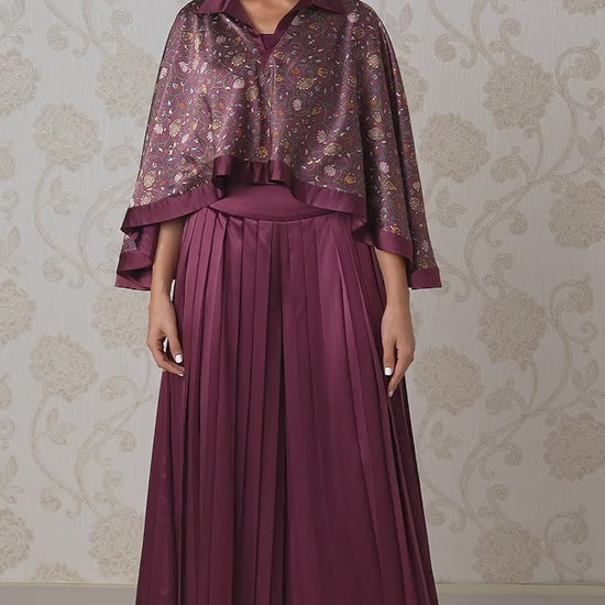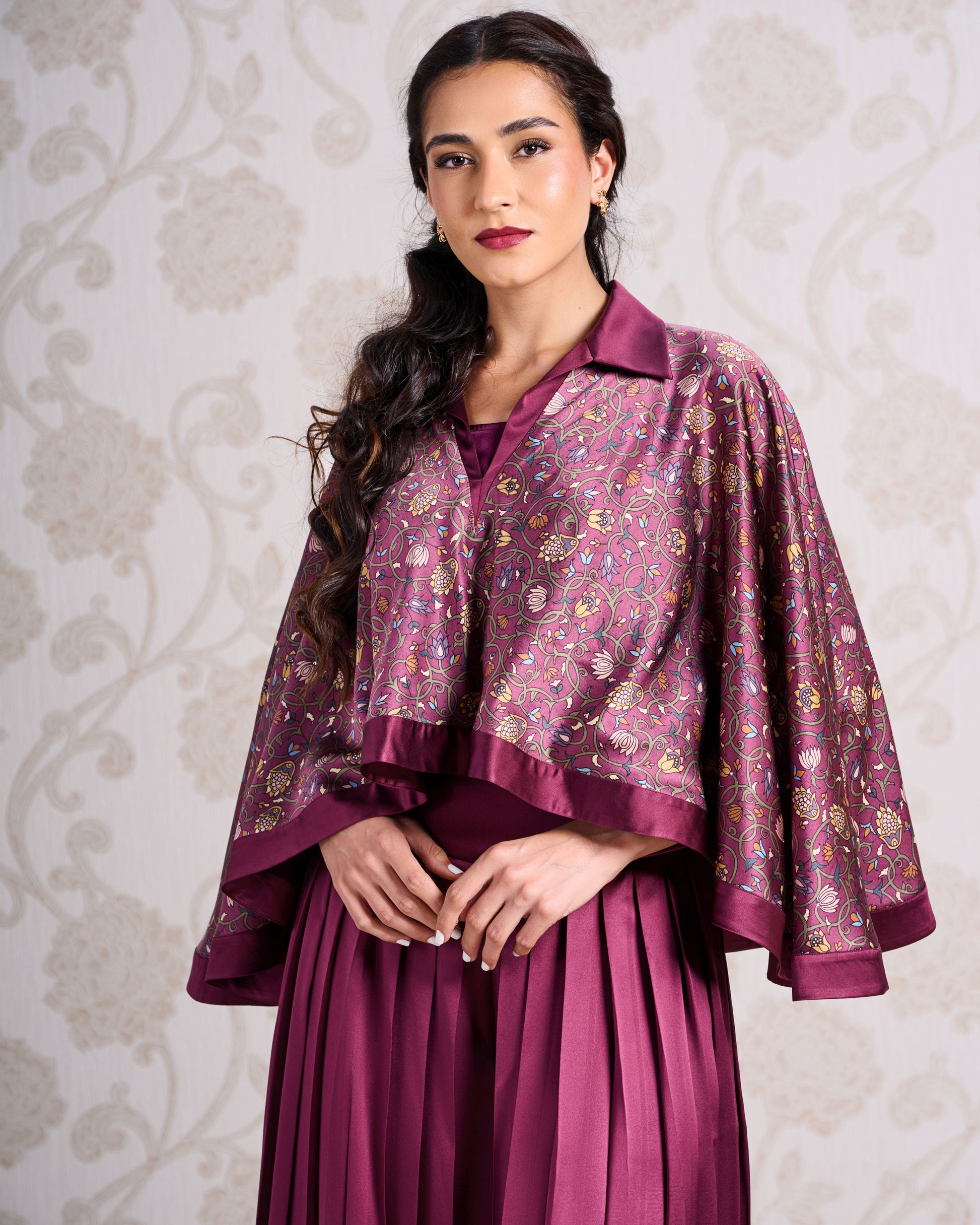 Romantic and refined, this set is crafted from luxurious Silk Satin, with the top showcasing an intricate digital print in a rich Wine Bouquet hue, balanced by solid wide-leg pleated trousers for a striking contrast. Finished with delicate Swarovski crystals, the ensemble shimmers with understated sparkle — elegant, modern, and effortlessly captivating.